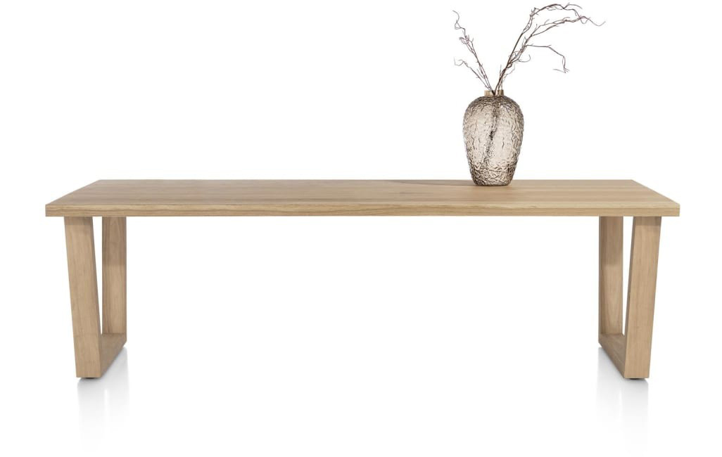 Bukavu est une grande table de salle à manger en placage de chêne de couleur naturelle. Les deux pieds en V en bois lui donnent un aspect moderne. Le plateau mesure pas moins de 230 x 100 cm. Cette table de salle à manger accrocheuse est finie avec une laque platine, ce qui la protège bien contre les taches.
